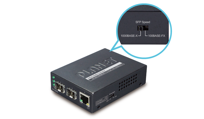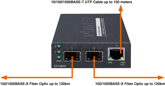 Via the built-in DIP switch on rear panel, the GT-1205A can be configured as supports 100BASE-FX SFP module or 1000BASE-X SFP module on its dual SFP slots, the GT-1205A can be connected over fiber optic cabling at a distance extended from 550 meters to 2km (multi-mode fiber) to 10/20/40/80/120 kilometers (single-mode fiber or WDM fiber), using the PLANET MFB/MGB series 100/1000BASE-X SFP modules.