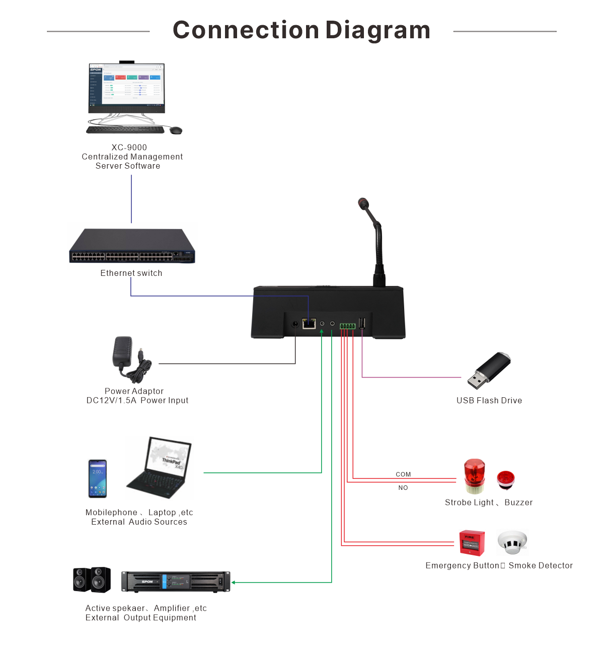1×RJ45 Ethernet Port, 1×USB 2.0, 1×Line Input, 1×Line Output, 1×Relay Input, 1×Relay Output |