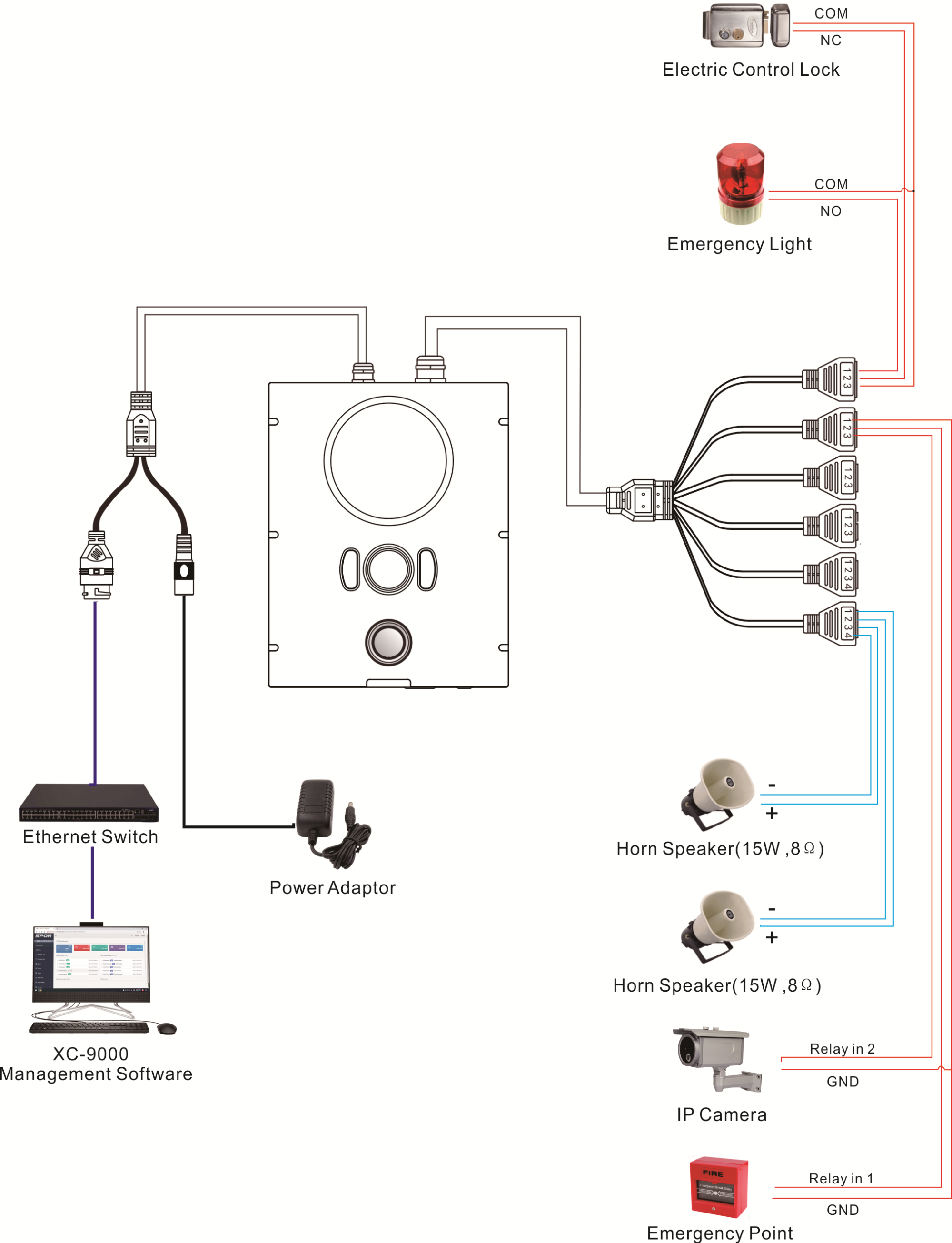 1×RJ45 Ethernet Port, 2×Relay input, 1×Relay Output, 2×Line input, 1×Line Output, 2×Speaker Output (8Ω/20W), 1×Power Input |