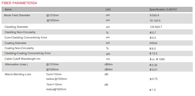 ANSI/TIA-568-C.3, ANSI/TIA/EIA-568-B.3, ISO/IEC 11801:2002, ANSI/ICEA 696, Telcordia (Bellcore) GR-20-CORE, ITU-T G.657A1/G.657A2 (Singlemode),