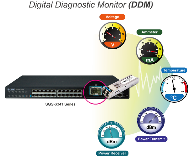 The SGS-6341-24P4X supports SFP-DDM (Digital Diagnostic Monitor) function that greatly helps network administrator to easily monitor real-time parameters of the SFP and SFP+ transceivers, such as optical output power, optical input power, temperature, laser bias current, and transceiver supply voltage.
