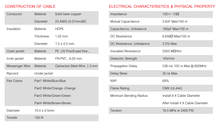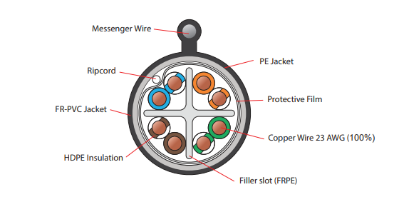 Self-supporting.4 twisted-Pair cable, Using solid bare copper conductor 23 AWG,