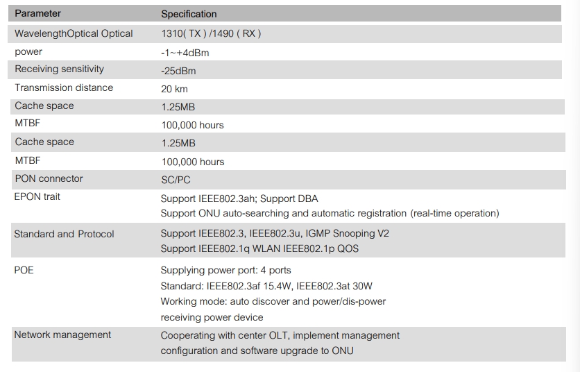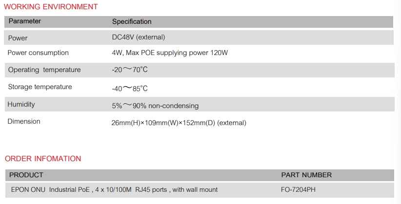 FO – 7204PH ONU is Industrial type POE product, with four fixed 10/100Mbps auto-adapted POE ports. It supports