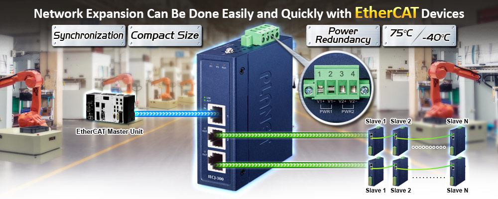 PLANET IECJ-300 is an industrial EtherCAT junction slave equipped with the EtherCAT protocol for today’s distributed industrial applications. The IECJ-300 3-port EtherCAT junction can be used in an EtherCAT Terminal segment at any desired position between the EtherCAT Terminals and enables the configuration of the EtherCAT star topology. A modular EtherCAT star hub can be realized by using several IECJ-300 units in a station. Its compact size and DIN-rail mounting make installation in a cabinet easy. Pluggable terminal blocks and LED indicator help users to maintain and set up their system.