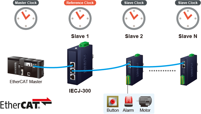 An EtherCAT slave is an electronic device that carries out cyclical sequences of calculations and/or data copying tasks at a certain interval (cycle). The EtherCAT slave working cycle (e.g. in the range of a few µs up to several ms) can be derived from different sources. EtherCAT node can measure time difference between leaving and returning frame. With distributed clocks, EtherCAT can realize a precise synchronization time of <1us between each slave module.