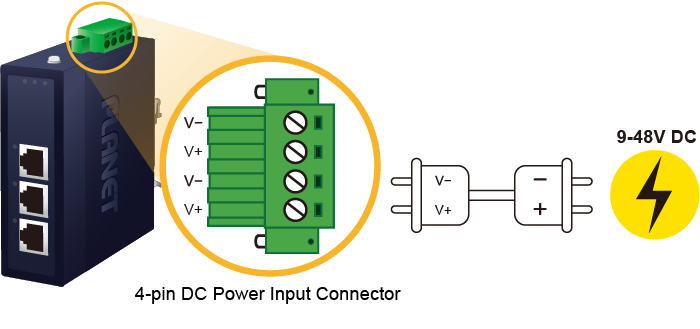 The IECJ-300 is equipped with one 4-pin DC power input connector with screws for power supply installation. With power magnetic protection design, it can avoid the device burnout due to wrong wiring. In addition, it also possesses an integrated power supply source with wide-ranging voltages (9 to 48V DC) for worldwide high availability applications.