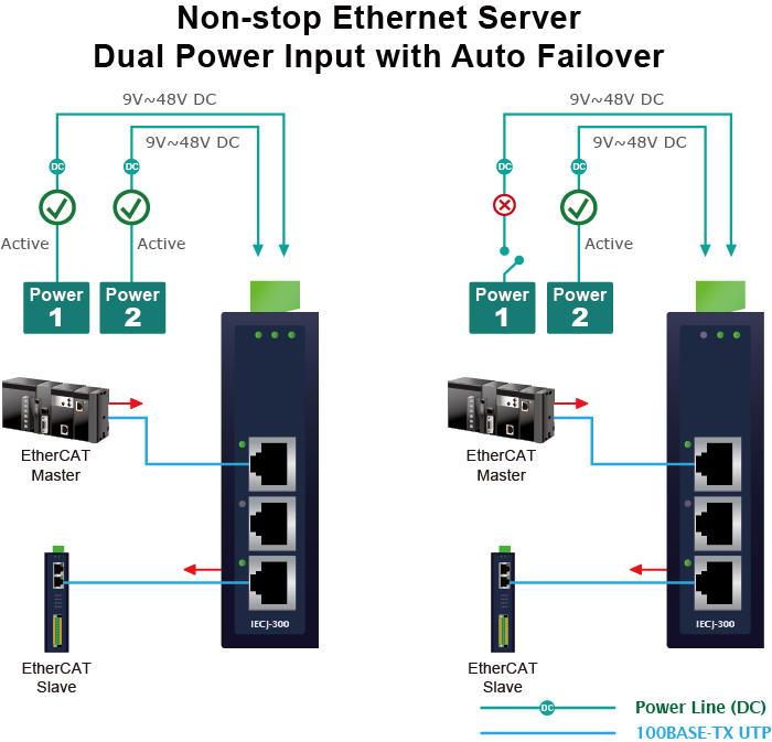The IECJ-300 features a strong dual power input system with wide-ranging voltages (9V~48V DC) incorporated into customer’s automation network to enhance system reliability and uptime. In the example below, when power supply 1 fails to work, the hardware failover function will be activated automatically to keep powering the IECJ-300 via power supply 2 alternatively without any loss of operation.