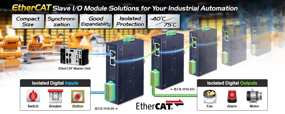 PLANET IECS-1116-DO is an industrial EtherCAT slave I/O module equipped with the EtherCAT protocol for today’s distributed industrial applications. The IECS-1116-DO provides high-density digital output channels and is protected with 3750 VDC isolation. Its compact size and DIN-rail mounting make installation in a cabinet easy. Pluggable terminal blocks and LED indicator help users to maintain and set up their system.