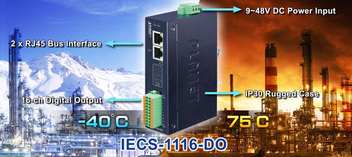 With the IP40 metal industrial case, the IECS-1116-DO provides a high level of immunity against electromagnetic interference and heavy electrical surges which are usually found on plant floors or in curb-side traffic control cabinets without air conditioning. It features a ventilated construction in which a cooling fan is not necessary, thereby making its operation noiseless. Being able to operate under the temperature range from -40 to 75 degrees C, the IECS-1116-DO can be placed in almost any difficult environment.