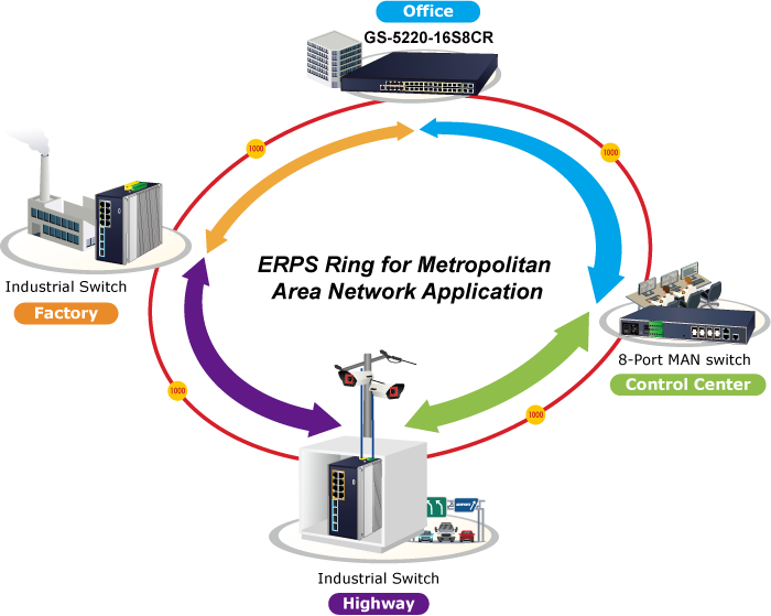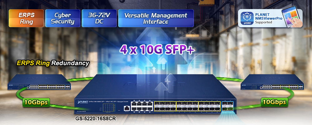 The GS-5220-16S8CR supports redundant ring technology and features strong, rapid self-recovery capability to prevent interruptions and external intrusions. It incorporates advanced ITU-T G.8032 ERPS (Ethernet Ring Protection Switching) technology and Spanning Tree Protocol (802.1s MSTP) into customer’s network to enhance system reliability and uptime in harsh environments.