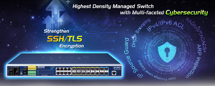 The MGSW-24160F supports SSHv2 and TLSv1.2 protocols to provide strong protection against advanced threats. It includes a range of cybersecurity features such as DHCP Snooping, IP Source Guard, Dynamic ARP Inspection Protection, RADIUS and TACACS+ user accounts management, SNMPv3 authentication, and so on to complement it as an all-security solution.