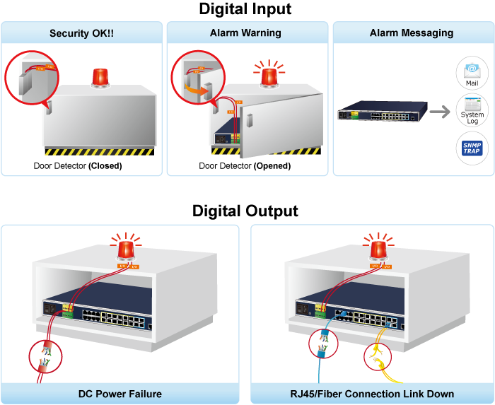 The MGSW-24160F supports Digital Input and Digital Output through a terminal block located on its front panel. This external alarm enables users to use Digital Input to detect and log external device status (such as door intrusion detector), and send event alarm to the administrators. The Digital Output could be used to alarm the administrators if the MGSW-24160F port shows link down, link up or power failure.