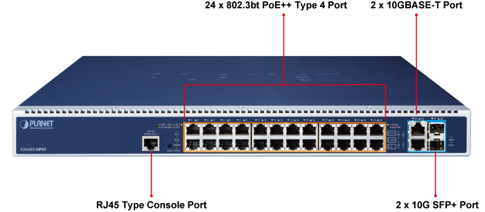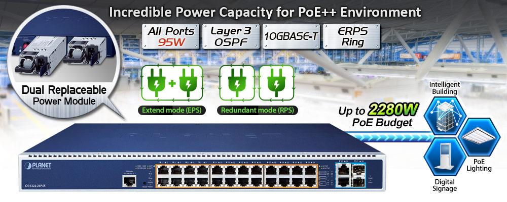 PLANET GS-6322-24P4X Fully-managed 802.3bt PoE++ Switch with dual modular power supply slots expandability promotes power management efficiency and flexibility in large-scale networks, such as enterprises, hotels, shopping malls, government buildings, and other public areas. It supports rich PoE operation modes including 24 90-watt 802.3bt type-4 PoE++ ports, 95-watt PoH (Power over HD-BASE-T) mode and 4-pair force mode to solve the incompatibility of non-standard 4-pair PoE PDs in the field. With a total power budget of up to 2,280 watts for different kinds of heavy PoE applications, the GS-6322-24P4X provides a quick, safe and cost-effective 802.3bt PoE network solution for small businesses and enterprises.