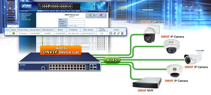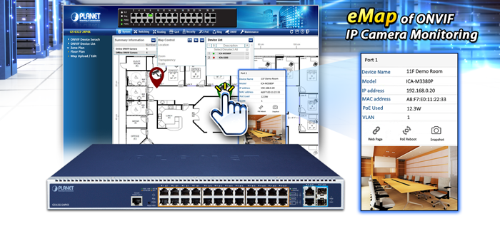 The GS-6322-24P4X supports an awesome feature — ONVIF Support — which is specifically designed for co-operating with Video IP Surveillances. From its GUI, clients just need one click to search and show all of the ONVIF devices via network application. In addition, clients can upload floor images to a switch and it allows you to deploy any surveillance devices for easier inspection and planning. Moreover, clients can get real-time surveillance’s information and online/offline status, and also allows PoE reboot control from GUI.