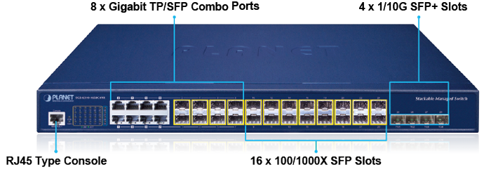PLANET SGS-6310 series is a brand-new Layer 3 Stackable Managed Gigabit Switch with 10Gbps uplink capability for various kinds of network applications and flexible deployment. The SGS-6310-16S8C4XR features 24 100/1000BASE-X SFP ports and 8 10/100/1000BASE-T RJ45 copper ports, shared with Ports 1 to 8, and 4 1G/10GBASE-X SFP+ ports with 128Gbps switch fabric delivered in a 1U rugged case design.