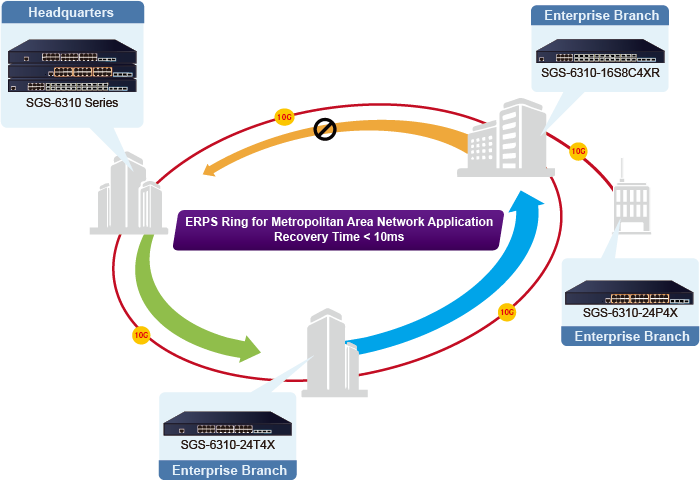| Ring | Supports ITU-G G.8032 ERPS Recovery time < 10ms @ 3units Recovery time < 50ms @ 16units |