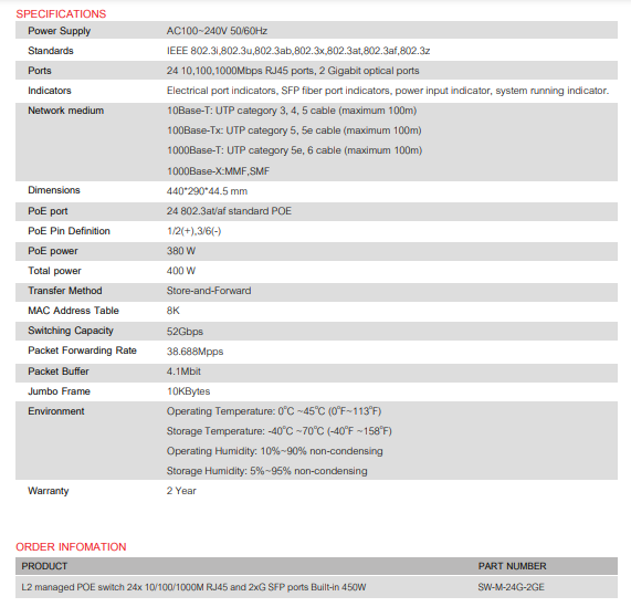 – 24 PoE ports support IEEE802.3af/at, per poe port up to 30W, and 400W total power.